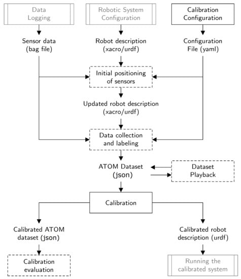 Figure 4 provides a schematic of the proposed calibration framework. To perform a system calibration, ATOM requires data logged from the system’s sensors, provided in the format of an ROS bag file, and also a description of the configuration of the system, as given in ROS xacro (http://wiki.ros.org/xacro, accessed on 25 November 2022) or urdf (http://wiki.ros.org/urdf, accessed on 25 November 2022) formats. Note that these two requirements are external to ATOM and are not considered a heavy burden since the typical configuration of robotic systems in ROS already includes them. In ATOM, the calibration procedure is structured in five phases, which occur in sequence: (1) calibration configuration, (2) initial positioning of the sensors (not mandatory), (3) data collection and labeling, (4) dataset reviewer (not mandatory) and (5) calibration. Each of these will be described in detail in the next sections.