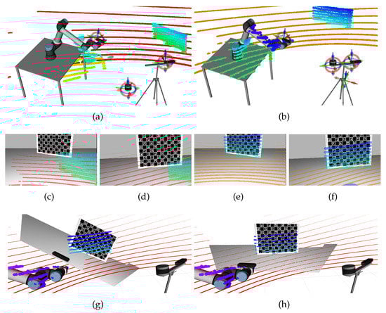 Sensor calibration can be divided into three different variants [], depending on the configuration of the system. The classic one is called sensor to sensor. In this variant, the objective is to retrieve the transformation of one sensor with regard to another. Some examples are RGB camera to RGB camera calibration [,] and Light Detection And Ranging (LiDAR) to LiDAR calibration [,]. The second variant, sensor in motion, refers to the case of a moving sensor, and the objective is to estimate the transformations between the different poses of the sensor over time. Some examples are Simultaneous Localization and Mapping (SLAM) [] and Structure From Motion (SFM) []. The third variant, sensor to frame, aims to estimate the transformation between a sensor and a coordinate frame of interest. Some examples are the hand–eye calibration [] and the RGB camera to robot frame calibration [].