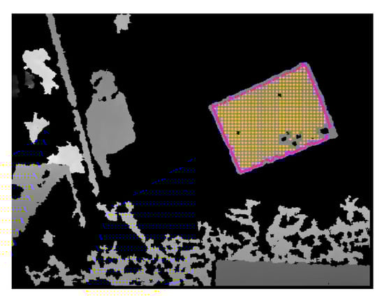 The depth sensor modality yields a representation for the labels similar to the one previously described for the LiDAR modality []. It contains pattern points (magenta points in Figure 9), and also boundary points (yellow points in Figure 9). The boundary points differ from the depth to the LiDAR modalities because LiDAR sensors have a small vertical angular resolution with regard to the horizontal resolution. This leads to the annotation of only two horizontal boundary points per vertical LiDAR layer, as defined in Equations (1) and (2), and displayed in Figure 8.