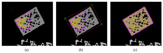 On the depth modality, the pattern points and boundary points (see Section 3.5) are presented in yellow and magenta, respectively, in Figure 11. The depth image is presented in RViz and the user can click on it to select a point. This point is represented visually with a green square surrounding it. Then, if a second point is selected, a red line connects both. This process continues to connect points whenever a new one is placed. If the user clicks near the first point, a polygon is formed from the connecting lines. All depth measurements inside the polygon are considered to be inside the pattern. Then, we process this data to sub-sample and remove pixel coordinates that correspond to invalid range measurements. A convex hull operation is used to generate the boundary points. Figure 11a–c shows a sequence of images representing the depth labeling correction procedure: in (a), it is clear that the labels generated from the semi-automatic labeling procedure are inaccurate; in (b), the user creates a polygon surrounding the pattern by clicking on four different points in the image, which define the corners of the red polygon; in (c), the new labels for the depth image are extracted from the polygon, as described above.