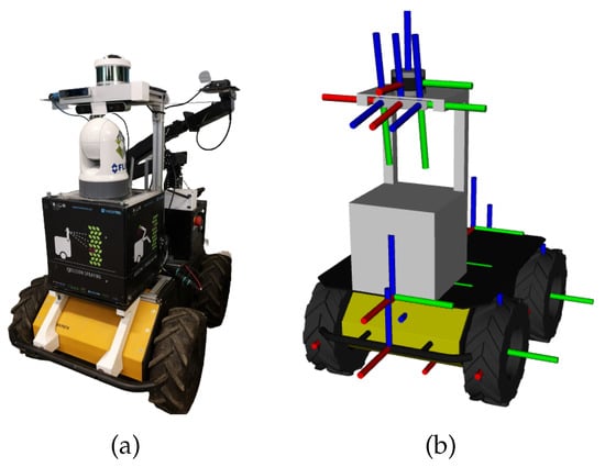 The results are presented in five distinct robotic systems. The MMTBot is a robotic system that contains two RGB cameras and one 3D LiDAR, as already described in section Section 3.1. This system configuration can be seen as a sensor-to-sensor, as well as a sensor-to-frame calibration problem. The AtlasCar2 [,,] is a prototype of an autonomous vehicle equipped with several sensors, namely two RGB cameras and two 2D LiDARs. This system configuration can be seen as a sensor to sensor calibration problem. Figure 13 presents the AtlasCar2, both the real system (a) as well as the digital model used in the framework (b). The AgRob V16 [] (Figure 14) is an agronomic vehicle with a 3D LiDAR and a stereo camera system. In this case, we are dealing with a sensor-to-sensor calibration problem. The Iris UR10e [] (Figure 15) is a system composed of a robotic arm containing two RGB cameras, one fixed to the end effector of the robotic manipulator and the other mounted on a tripod. This system is a hand–eye calibration system, which is simultaneously a sensor in motion and sensor to sensor calibration problem. LARCC [] (Figure 16) is a collaborative cell equipped with a robotic manipulator, three RGB cameras, three 3D LiDARs and one depth camera. This system is a sensor-to-sensor calibration problem, with a large number of sensors and modalities, which makes the problem of calibrating such a system very challenging.