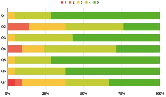 Responses to questions Q1–Q7. Likert scale from 1 (strongly disagree) to 5 (strongly agree). Q1—The calibration is a crucial component of a robotic system. Q2—A calibration approach should be interactive, since that helps to produce better calibrations and understand why something went wrong. Q3—It is helpful to have the visualization of different calibration components. Q4—The user should have detailed control of the calibration procedure, for example, being able to configure the calibration or to inspect and correct labels. Q5—The ability to calibrate systems with more than two sensors is important in a calibration approach. Q6—The ability to calibrate systems with several sensor modalities is important in a calibration approach. Q7—It is not ideal to calibrate complex, multi-sensor, multi-modal robotic systems with different approaches for each combination of sensors and modalities.
