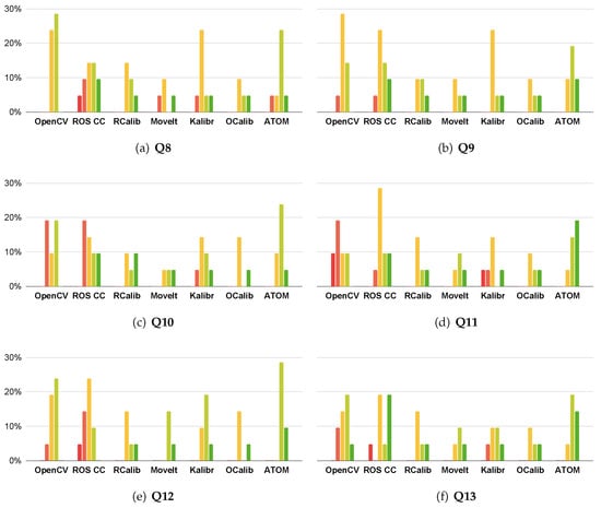 The second group of questions (Q8–Q13) asks the users to assess several calibration approaches comparatively. As discussed in Section 2, these approaches are: OpenCV Camera Calibration (OpenCV) [], ROS Camera Calibration (ROS CC), Robot Calibration (RCalib), MoveIt Calibration (MoveIt) [,], Kalibr (Kalibr) [,,,,], OpenCalib (OCalib) [] and ATOM (ATOM). Results are presented in Figure 18. In Q8, OpenCV, ROS Camera Calibration and ATOM are the approaches that are reportedly easier to use. Note that while ATOM can calibrate complex robotic systems with a large number of sensors and several sensor modalities, the other two approaches (OpenCV and ROS Camera Calibration) are limited to pairwise RGB systems. Q9 focuses on how intuitive the approach is. ATOM was reported as the most intuitive calibration framework. We believe this is due to ATOM’s procedures being often accompanied by visualization and interactive functionalities. Q10 measures the information provided by the calibration framework. OpenCV and ROS Camera Calibration exhibit the poorest performance, possibly due to the fact they do not convey information to the user in many calibration stages, such as the estimation of extrinsic parameters. ATOM and Robot Calibration provide useful information. In Q11, OpenCV has the least helpful interface, which is understandable since it is an API and not an application. ATOM and MoveIt Calibration are the approaches with the most helpful interface, both based on RViz. In Q12, users consider ROS Camera Calibration as the less accurate calibration procedure. ATOM is reported to be accurate by all users who have experienced it. In Q13, ROS Camera Calibration and ATOM present the most easy to integrate outputs. Both use ROS readable formats.