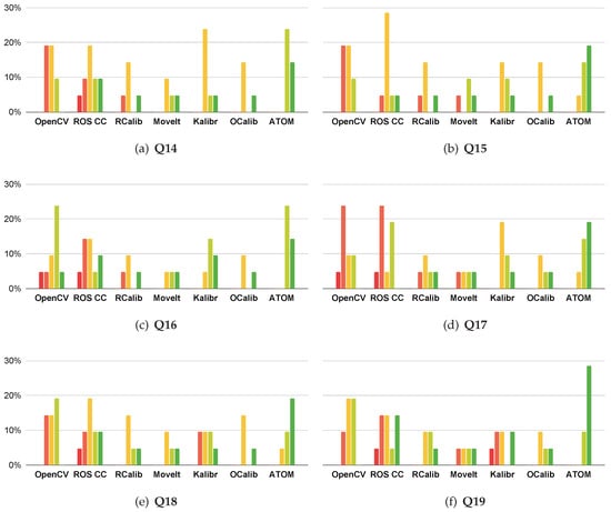 Responses to questions Q14–Q19. Likert scale from 1 (strongly disagree) to 5 (strongly agree). Red represents 1, orange represents 2, yellow represents 3, light green represents 4 and green represents 5. Q14—The collection of data for calibration is well solved by this approach. Q15—The labeling of data for calibration is well solved by this approach. Q16—The estimation of extrinsic parameters is well solved by this approach. Q17—The evaluation of the result of the calibration is well solved by this approach. Q18—The approach successfully calibrated my robotic system. Q19—I am likely to use this approach again.