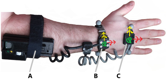 Wearable device showing Datalogger (A), wrist IMU (B), and hand IMU (C). Positive directions for the local sensor coordinate systems are approximately aligned with distal (red) radial (yellow) and dorsal (green) axes.