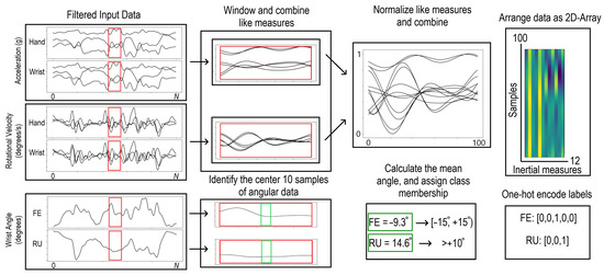 All data from the wearable and from the VICON motion capture system were recorded at 100 Hz. Motion capture derived angular data were filtered using a zero lag Butterworth lowpass filter with a cut-off frequency of 5 Hz, and inertial data were filtered with a zero lag Butterworth lowpass filter with a cut-off frequency of 6 Hz [23]. Acceleration and rotational velocity data were normalized to be between 0 and 1. Inertial data were restructured into 12 × 100 windows consisting of 12 inertial measurands over 100 samples (1 s) with a 90-sample overlap (i.e., 10 windows per second). Detailed preprocessing procedures are shown in Figure 5. The posture associated with each window was computed as the mean of the 10 samples in the center of each window. The mean posture was then binned into one of five postural bins for FE and one of three postural bins for RU. FE bins were , and RU bins were . Binned wrist postures are already used within ergonomic assessments such as the SI, RULA, and REBA [7,8,9]. Binning postures in this manner greatly simplifies the estimation problem, while ensuring that this system can produce data which fits within existing ergonomic assessment frameworks. These bins were selected because of their use in previous work, particularly that of Kociolek et al. and Mckinnon et al. in their assessments of the reliability of human raters evaluating wrist postures using video analysis [10,27]. This choice makes it practical to compare directly with the performance of human raters.