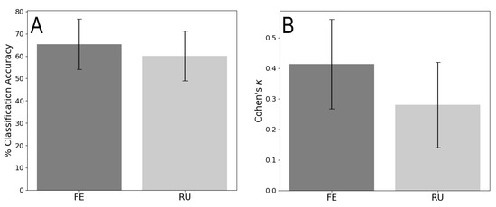 Mean model accuracy and Cohen’s with standard error are presented in Figure 7. A precise breakdown of model classification accuracy is shown in Table 1 (FE) and Table 2 (RU).