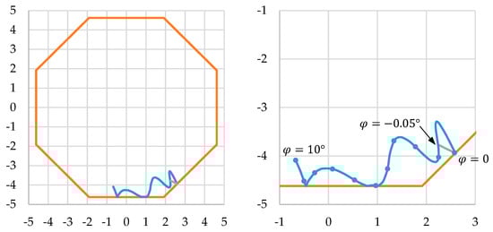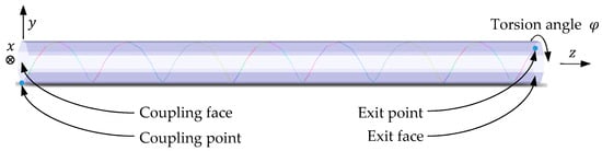 The laser beam is coupled into the rod at the middle of a lateral face (see Figure 4, left). The position where it leaves the rod at the opposite face strongly depends on this coupling position and on the whole geometry. In this example (, , , ) the exit point is quite far away from any lateral face for the undeformed rod () (Figure 6). As the torsion angle increases (), the exit point moves on a slightly wavy line (blue curve). A torsion of results in a deviation of the exit point position of . This relatively small distance corresponds to 1.61 pixels assuming an exemplary pixel size of the detector of 5 µm × 5 µm. Here, for simplification, a laser movement in the direction of a pixel edge is assumed.