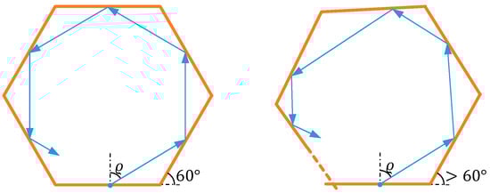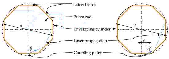 An efficient and sensitive measurement system can be designed when the deviations in angle and position increase with each reflection and significantly influence the outcoupling position of the laser beam. To verify this assumption, the situation is simplified to a two-dimensional problem (Figure 2). The reflection of a ray in the polygonal cross-section of the rod is considered, ignoring its propagation along the -axis. While the ray starts in the middle of one edge and also hits the neighboring edge in its middle in the undeformed case, a specific change is applied to all corner angles (Figure 2, right image).