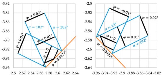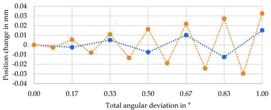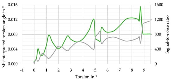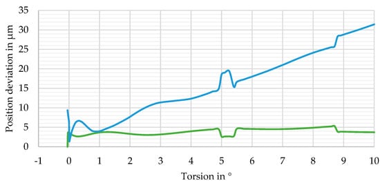 If the temperature change cannot be detected otherwise, it will be misinterpreted as deformation, e.g., as torsion. This “misinterpreted torsion angle” is calculated using the local sensitivity for torsion (Figure 9) and the position deviation from Figure 16. This approximation ignores the direction of the position change and, therefore, gives the most critical values. The resulting “misinterpreted torsion angles” are presented in Figure 17 (green curve) for the relative assembly and a temperature change of . The angles are quite small, below 0.0051°, for torsion angles in the range .