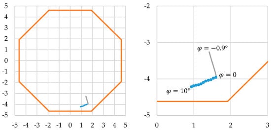 Position of the laser beam at the exit face in dependence of the torsion angle. Blue: , grey: , orange: shape of the exit face. Dots in enlarged diagram for each full degree of . Dimensions are in .