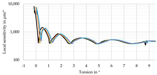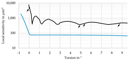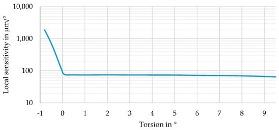 The spacing of the dots in Figure 6 (enlarged image on the right), which mark full degrees of , is not constant. While they are in close neighborhood for (blue curve), the grey curve (opposite direction) only goes to and, therefore, does not show a single dot. This indicates that the sensitivity of the sensor system strongly depends on the actual torsion angle . The local sensitivity of the system is determined according to Equation (4) by comparing the position of the exit point of the laser for one torsion angle with the neighboring points and (one in a positive and one in a negative direction) and dividing it by the difference of the torsion angles.