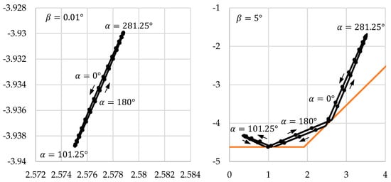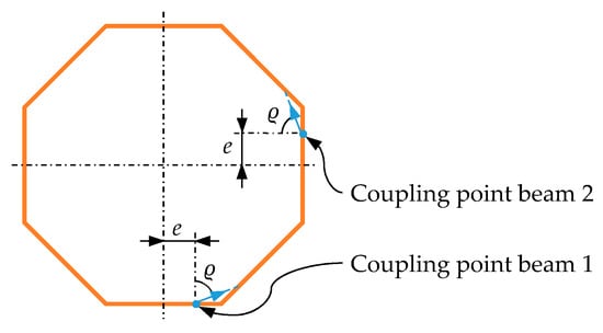 Comparing beams 1 and 2 (see Figure 13), the whole pattern in Figure 14 is rotated by 90°, as are the coupling points of the lasers. In this way, each combination of , and leads to a specific pattern of the two laser exit points so that a distinction between torsion and different bending directions is possible. Due to the complexity of the exit point movement under torsion (Figure 8) it is not clear if the patterns are always unique.
