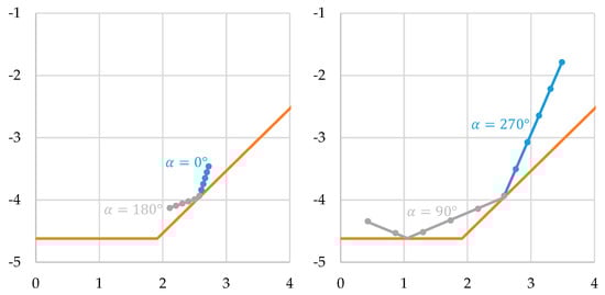 The influence of the bending angle for four exemplary orientations (angle ) is given in Figure 12. The bending intensity varies between and , while each dot marks a full degree. The comparison of the left and right image in Figure 12 shows that the direction in which the laser beam moves does not clearly identify the bending direction . In parallel, the displacement of the beam position gives no hint about the bending intensity . This is not desirable because it makes it impossible to determine the bending parameters and and it is difficult to distinguish between torsion and bending. To overcome these limitations, more than one laser beam can be used. Several approaches are possible here, two of which will be discussed in the following section.