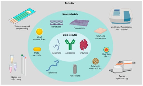 Modern biosensors are usually endowed with (i) efficient capturing of specific targets with no off-target interaction, (ii) transformation into electrochemical, electrical, optical, gravimetric or acoustic signals, (iii) sensitivity, short response time, reproducibility and low detection limit (LOD) and (iv) miniaturized components []. In the attempt to improve these features, great results have been achieved by taking advantage of 0D, 1D and 2D nanomaterials for their unique chemical and physical properties, which make them highly performing compared to the bulk counterparts. Biomolecules represent naturally occurring ready-to-use nanomaterials as they are nanoscopic objects with regular shape, high binding specificity and affinity, surfaces suitable for chemical functionalization and catalytic activity as in the case of enzymes, for instance []. Moreover, biomolecules can be modelled via genetic and protein engineering [,] and their surfaces enable the interaction with other nanomaterials; as a result, biomolecules have been widely exploited to functionalize nanomaterials thus enabling precise tailoring of hybrid functional bioconjugates at the nanoscale [,,]. Beyond biomolecules, organic and inorganic nanomaterials with sharpen architecture have attracted interest for their high surface-to-volume ratio, conductivity, shock-bearing ability and optical tunability, e.g., nanoparticles, nanotubes, nanorods, graphene, nanofibers, molybdenum disulfide, carbides, nitrides, carbonitrides and quantum dots []. Their features have impelled biosensing accuracy and robustness and disclosed tunable electrochemical and physical-mechanical responses. For instance, nanomaterials integrated in a sensor can sensibly decrease the LOD and thus increase the sensitivity in minimal processing time to reach high specific detection of a target [,,].