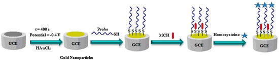 A representative example is reported by Beitollahi et al. [] that developed an electrochemical aptasensor to detect in blood serum and urine the amino acid homocysteine, a highly reactive sulfur-containing compound that turns into an intermediate by-product during the metabolism of dietary methionine (Figure 2). In this study, gold nanoparticles (AuNPs) are synthesized via electrodeposition onto the surface of a glassy carbon electrode and exploited to stably bind thiolated aptamers (SH-aptamers) targeting homocysteine. The interaction between the AuNPs and the SH-aptamers occurs through involvement of strong thiolate-gold bonds, which allow the aptamer molecules to form a self-assembled monolayer on the metal surface, a molecular arrangement that is preferable to achieve linear detection of the analyte. The authors used voltametric measurements to reveal the binding of the homocysteine molecules to the aptamer probes with an LOD down to 0.01 μM and a linear response within the range 0.05–20.0 μM; indeed, the interaction between the aptamer probes and the homocysteine molecules triggers a fold change in the aptamer molecular structure that increases the accessibility of the underlying glassy carbon electrode leading to enhanced redox reactions and therefore increases the voltametric and current values. This aptasensor has been proposed as a potential device for healthcare purposes, especially for detecting homocysteine as a biomarker in hyperhomocysteinemia.