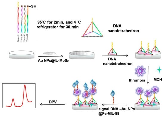 As the complexity of the nanomaterial laying onto the electrode is increased or several nanomaterials are combined to produce more complex composites, the performances of the aptasensor are enhanced to reach very low LODs. For instance, the study by Xie et al. [] is worth mentioning as it describes an aptasensor able to detect very low amounts of thrombin in blood serum with no interference from nonspecific adsorption, environmental changes or instrumental efficiency by taking advantage of a hybrid configuration (Figure 3). To realize this aptasensor, AuNPs are synthesized via heating in solution and are loaded onto a mixture reaction of aminated ionic liquid NH2-IL and 2D nanosheets of molybdenum disulfide (MoS2), the former helping the nanomaterial to stabilize via electrostatic repulsion and avoiding aggregation. The resulting AuNPs-IL-MoS2 composite is dried onto a glassy carbon electrode and furnishes a proper binding surface for the adsorption of DNA nanotetrahedrons, which are obtained by warming and cooling of four different SH-DNA sequences. The thrombin analyte molecules can bind to the aptamers and the resulting thrombin-DNA nanotetrahedron complex is sandwiched using a third nanostructured composite AuNPs-Fe-MIL-88 where AuNPs are loaded onto hydrothermally synthesized Fe-MIL-88 metal-organic frameworks (MOFs), which in turn are labeled with a fifth DNA sequence recognizing the thrombin-DNA complex. The authors recalled two import features of such high-complex devices: first, in contrast to traditional stem-loop structures or linear DNA probes, the enhanced mechanical rigidity of the DNA nanotetrahedrons increases the accessibility of the target molecules and their loading amounts; secondly, this aptasensor results bind to many interfering substances even when their concentrations are greater than the concentration of thrombin. This aptamersensor shows an LOD of 56 fM within a large linear range of 0.298–29.8 pM thus representing a potential detector for ratiometric methods in clinical applications.