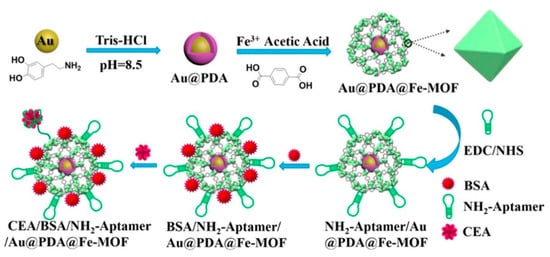 In this context, another prominent example is reported by Li et al. for detecting carcinoembryonic antigen in blood serum []. The aptasensor enables dual binding sites and dual signal amplifying electrochemical sensing by means of self-polymerized dopamine-functionalized AuNPs (Figure 4). AuNPs are chemically synthesized and decorated with dopamine moieties under oxidative and alkaline conditions to trigger dopamine polymerization over the gold surface. These polymeric hybrid constructs provide anchoring sites for Fe3+ through coordination bonds to form Fe3+-catechol MOFs with an octahedron shape and the presence of acetic acid increases the number of carboxyl groups (-COOH) regulating the nucleation and growth rate of the Fe3+-catechol MOFs on the surface of the AuNPs. The presence of several -COOH groups within the framework complexes is exploited to link carcinoembryonic antigen-specific aminated aptamers (NH2-aptamers) via classical 1-Ethyl-3-(3-dimethylaminopropyl)carbodiimide/N-hydroxysuccinimide (EDS/NHS) crosslinking reaction to achieve a colloidal aptasensor with high sensitivity and selectivity, good biocompatibility and strong stability. These functionalized AuNPs can be used to coat a glassy carbon electrode and detect carcinoembryonic antigen in serum. Note that both the polydopmine moieties and the Fe3+-catechol MOFs accelerate the electron transfer on the electrode interface, increasing the amplification of the current signals and therefore enhancing the sensitivity of the device. The authors used such a complex aptasensor to detect the carcinoembryonic antigen in the concentration range of 1 fg mL−1–1 μg mL−1 with a LOD as low as 0.33 fg mL−1 and proposed it for detection of the carcinoembryonic antigen biomarker in early clinical diagnosis.