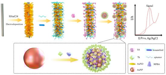 In this context, an example of an aptasensor developed by Lv et al. [] is significative for involving unusual electrode-supported dendrite-like nanostructures. In this example, carbon cloth-supported Au nanodendrites functionalized with AuNPs and terminal-free aptamers are realized for sensing sialic acid in blood serum (Figure 5). To realize the device, large 1 × 1.5 cm carbon cloth electrodes are used as substrate for synthesis via the electrodeposition of Au nanodendrites protruding to the solvent solution to guarantee high surface area and high conductivity along the carbon length. The resulting nanodendrites can be coated via simple adsorption with unfunctionalized aptamers targeting sialic acid. Colloidal AuNPs are then synthesized via a chemical reduction and functionalized with 4-mercaptophenylboric acid and thionine via boronic acid-diol binding. The aptamers are exploited as the sensing element from blood followed by the attachment of the modified AuNPs where the electrochemical reduction of the thionine moieties triggers the signal amplification all along the entire large surface of the gold nanodendrites. The device has been described to detect sialic acid concentrations up to LOD of 60 nM within a linear range of 0.1–440 μM and proposed to evaluate sialic acid levels in human serum.