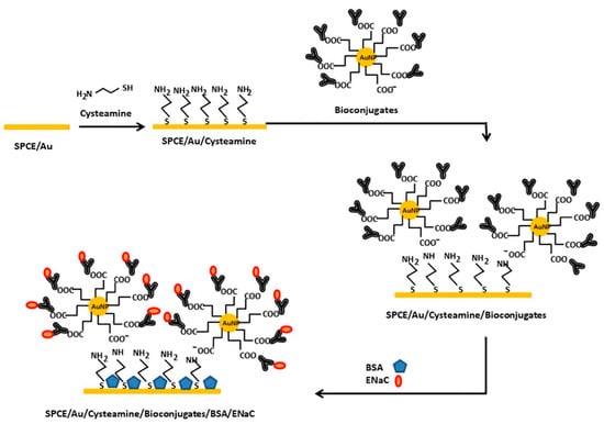 Like aptamers, proteins have been widely exploited as probes in sensing applications where traditional voltametric electrode-based sensors are the most explored to reveal the presence of specific analytes. Antibodies are found in most of the biosensors reported in literature, which are referred to as “immunosensors”. The basic principle of immunosensors recalls the one exploited for aptasensors as it is based on a high specificity and high affinity binding to the target analyte that affects the electrochemical reaction rate on the electrode surface. Accordingly, coating the surface of the electrode with a blocking agent is one main condition to accomplish and to avoid non-specific adsorption and background noise. An example is shown by Hartati et al. [] that realized an electrochemical immunosensor based on antibodies-conjugated AuNPs to detect the epithelial sodium channel, a protein considered a biomarker in hypertension (Figure 6). The AuNPs are prepared using a wet synthesis through chemical reduction and reacted with SH-polyethylene glycol-COOH molecules through the formation of thiolate-gold bonds in order to coat the surface of the gold with –COOH monolayers. In this configuration, the surface of the AuNPs can be functionalized with antibodies specific for the epithelial sodium-channel protein acting as a molecular probe for high affinity and high-specificity recognition via the crosslinking reagents EDC/NHS that forms stable covalent bonds between the COOH– functional groups and the native NH2– groups located on the antibody surface. In these conditions, the polyethylene glycol molecules serve as spacers between the metal surface and the antibody molecules thus preventing nonspecific adsorption. As a voltametric apparatus, Au-screen-printed carbon electrodes are obtained through the electrodeposition of Au onto the surface of the carbon electrode followed by a coating with cysteamine, the latter acting as linkers between AuNPs and antibodies. The resulting modified electrode is used to detect via voltametric measurements the epithelial sodium-channel protein molecules in urine samples with an LOD of 2.8 × 10−1 ng mL−1 in the range of 9.375 × 10−2–1.0 ng mL−1 and is proposed as a biosensor for suspected hypertensive urine sample patients and an alternative method to replace the ELISA screening.