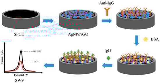 When approaching the use of more advanced nanomaterials in building efficient biosensors, proteins, enzymes and antibodies are largely considered as their intrinsic biochemical and structural features make them ideal candidates to assemble hybrid composites while keeping useful properties such as enzymatic activities, self-assembly behavior and biorecognition. As a first example, Chanarsa et al. [] reported a AgNPs-reduced GO composite as a component of an electrochemical immunosensor able to detect the immunoglobulin G as a model biomarker in blood serum (Figure 7). In their study, the authors realized an AgNPs-reduced GO composite from a heat-assisted wet chemical reduction that can be easily deposited onto a screen-printed carbon electrode and used as support for adsorption of unfunctionalized antibodies specific for immunoglobulin G (IgG). Interestingly, this very simple procedure leads to a hybrid multicomponent immunosensor with high specificity for its target being very unsensitive to 100-fold-concentrated interfering biological substances such as dopamine, glucose, interleukin-15 and myoglobin either used alone or mixed and showing a very low LOD value of 0.00086 ng mL−1 of IgG concentration within two working ranges, 0.001–0.05 and 0.05–50 ng mL−1. The authors proposed this device as a simple, low cost, high-sensitivity- and high-selectivity-method clinical diagnosis.