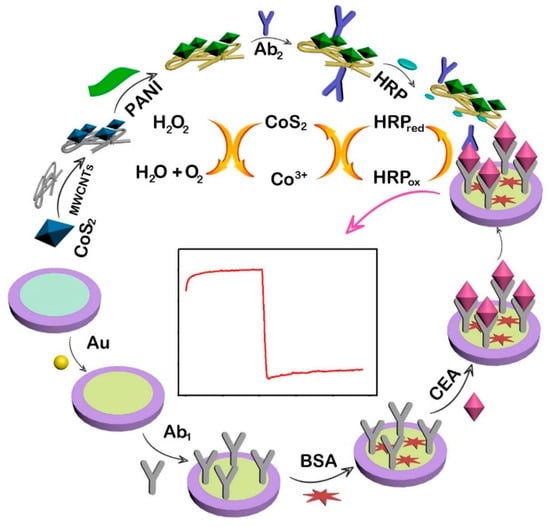 Interesting results have been published using alternative carbon allotropes such as carbon nanotubes (NTs), where the high aspect ratio guarantees large, functionalized surfaces compatible with biological probes. In this regard, Zhao et al. [] described a method to realize a sandwich-like electrochemical immunosensor based on multi-walled carbon NTs to detect the carcinoembryonic antigen in blood serum (Figure 8). In this study, a glassy carbon electrode is coated with AuNPs via electrodeposition, which act as supporting surfaces to link a first antibody that specifically targets the carcinoembryonic antigen analytes. The second component of the sensor is built using commercial carboxylated multi-walled carbon NTs that are functionalized with CoS2 using the hydrothermal method and distilled aniline under reduced pressure to get a nanostructured carbon NTs-CoS2-polyalinine composite with free NH2- groups. The amine groups allow double conjugation of the composite with secondary antibodies and the horseradish peroxidase enzyme; in this configuration, the secondary antibodies recognize the carcinoembryonic antigens captured on the electrode by the first AuNPs-bound antibody probes. In the presence of hydrogen peroxide, a triple reaction occurs on the immunosensor as the hydrogen peroxide is reduced to water using electrons coming from CoS2 that in turn is reduced back via the horseradish peroxidase enzyme (Figure 8). Under this setup, the polyaniline bound to the composite act as a non-diffusing electroactive substance that effectively transfers the electrons from the active center of the enzyme to the surface of the underlying glassy carbon electrode; meanwhile, it also acts as a signal amplificatory molecule and increases the signal-to-noise ratio, thereby improving the stability of the device. The authors used this complex system to detect the analyte as a biomarker in clinical diagnostics showing an LOD of 0.33 pg mL−1 within a wide range of 0.001–40 ng mL−1.