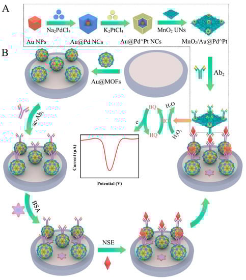 Electrochemical immuneosensor for neuron-specific enolase in blood serum. (A) A hybrid structure is formed using MnO2 nanosheets decorated with trimetallic Au-Pt-Pd nanocubes and conjugated to a secondary antibody. (B) Glassy carbon electrodes are coated with antibodies-functionalized AuNPs-embedded MOFs and used as support for the targeting antibodies probes. This sandwich-like architecture increases the electrochemical efficacy upon binding to the target molecules. Image adapted from [] with permission of American Chemical Society, 2020.
