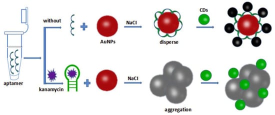 As a starting example, the study reported by Wang et al. [] describes a simple method for detecting kanamycin in milk using quantum carbon dots (CDs) and aptamers (Figure 10). In this study, AuNPs are synthesized via heat-assisted chemical reduction and used as support for coating with kanamycin-specific unfunctionalized aptamers; the aptamers-coated AuNPs remain stable in solution as single monodispersed colloidal NPs that resist to aggregation even after the addition of increasing amounts of NaCl salt, a well-known aggregating agent for metal NPs. In this status, the AuNPs can effectively quench the intrinsic fluorescence of the quantum CDs in solution as revealed using fluorescence spectroscopy. However, when kanamycin is revealed and captured it quickly starts competing for the binding with the aptamers thus breaking the low affinity adsorption interactions with the AuNPs; in these conditions, the monodispersed aptamers–AuNPs complexes are broken and the bare AuNPs become much more sensitive to the salt leading to visible aggregation. The so-formed aggregates change their absorption spectrum and no longer quench the fluorescence of the carbon QDs resulting in the recovery of the fluorescence signal that is linearly proportional to the concertation of kanamycin revealed. This aptasensor shows an LOD of 18 nM in the working range 0.04–0.24 μM and is proposed for the detection of antibiotics in food thus being adapted for several other antibiotics relying on different aptamer probes.