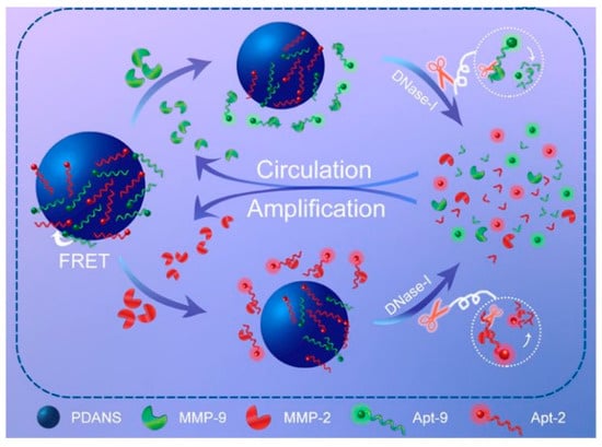 In this context, another significative example is described by Yu et al. [] that prepared polydopamine NSs and fluorescent aptamer probes provided with DNase-I-assisted recycling amplification to detect the matrix metalloproteinase-9 and -2 in the urine and tissue homogenate of unilateral ureteral obstruction mice (Figure 11). The polydopamine NSs are obtained via a simple chemical self-aggregation under controlled wet conditions before applying the two metalloproteinase-specific aptamers marked with two different fluorophores, i.e., 5-carboxyfluorescein and Texas Red. The adsorption of the aptamer probes is likely to occur via π-π interactions and hydrogen bonding leading to quenching of the fluorophores mediated by the neighboring polydopamine NSs based on the Förster resonance energy transfer (FRET). In the presence of the metalloproteinases, the respective aptamers become detached from the polydopamine surface leading to the release as free metalloproteinase-aptamer soluble complexes and therefore to recordable and significative fluorescence emission. Interestingly, the addition of DNase-I leads to an improvement in detection as it selectively cuts the aptamers dissociated from the polydopamine nanospheres and bound to the target analytes; this reaction in turn allows the released targets to further interact with the residual fluorescent aptamers still linked to the polydopamine surface triggering signal amplification. The authors demonstrated the efficacy of this method by detecting both the metalloproteinases, whose ratio could be considered as a potential indicator for evaluating the onset of renal interstitial fibrosis. The measured LOD values are 9.6 pg mL−1 (metalloproteinase-9) and 25.6 pg mL−1 (metalloproteinase-2) within the detection ranges of 24–600 pg mL−1 (metalloproteinase-9) and 64–1600 pg mL−1 (metalloproteinase-2). This strategy can be adapted to other nanomaterials such as the aptamer-coated AuNRs for enzyme-assisted detection of adenosine triphosphate, thus justifying its versatility and usefulness [].