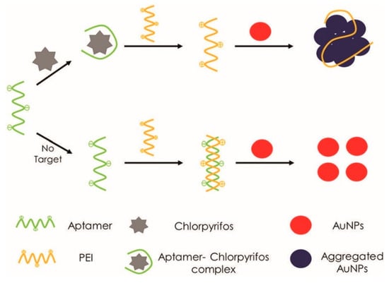 Besides fluorescence-based detection to capture analytes through aptamers-functionalized nanomaterials, other easier colorimetric methods have been developed alongside allowing the biosensing without the need of instrumentations. Indeed, colorimetry detection comes with changes in the optical properties of nanomaterials when they move from non-aggregated, monodispersed nanometric objects to clusters that aggregate and/or precipitate in solution, which usually show a red shift of their absorbance spectrum in the visible region []. As a typical study, Soongsong et al. [] reported on the realization of a facile colorimetric aptasensor to detect chlorpyrifos based on polyethyleneimine-induced aggregation of AuNPs (Figure 12). In their work, the authors obtained citrate-capped AuNPs using heat-assisted chemical synthesis in wet conditions and tested their aggregation upon the addition of various amounts of polyethyleneimine that is known to displace the citrate ions coating the AuNPs surfaces leading to their aggregation because of the loss of electrical repulsion in solution. The addition of chlorpyrifos-specific aptamers triggers the formation of aptamers–polyethyleneimine complexes through electrostatic bonds thus sequestering the organic polymer and avoiding the aggregation of the AuNPs that look like red colored colloids. When chlorpyrifos is added, its affinity towards the aptamer probes breaks the complexes formed by the aptamer and polyethyleneimine molecules, the latter becoming free to adsorb over the gold surface, leading to aggregation and an evident color change from red to blue through intermediate colors depending on the amount of analyte detected. It is important to recall that this simple aptasensor is very selective for chlorpyrifos, being almost blind to many other interfering compounds including divalent metal ions and biological molecules such as glucose, urea and oxalate. The authors claimed this device as capable of determining the presence of chlorpyrifos in several foods such as water, pomelo, and longan with an LOD of 7.4 ng mL−1 within a range 20–300 ng mL−1.