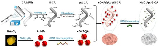 Other colorimetric approaches based on the aggregation of NPs have been developed to realize a ready-to-use and portable device with quick naked-eye recordable results. An example worth mentioning is the aptasensor proposed by Abedalwafa et al. [] as the supporting material is a portable strip rather than an electrode or colloidal solution. The device has been obtained by combining an electrospinning fabrication of nanofibrous (NF) membranes and a wet colloidal synthesis of NPs for colorimetric detection of the kanamycin (Figure 13). The authors grafted glutamic acid molecules into strips made by electrospun NF membranes of cellulose acetate to obtain COOH-functionalized NFs; these have been chemically modified through a classical EDC/NHS crosslinking coupling reaction that allows NH2-aptamers targeting kanamycin to be linked to the NF membranes using amide bond. As a probe, AuNPs are synthesized chemically and coated via adsorption with a complementary single-stranded DNA (cDNA) of the kanamycin aptamer and left to hybridize with the functionalized NF membranes by taking advantage of the hydrogen-based hybridization between the two nucleic acid strands. Because the aptamer shows higher affinity to the kanamycin molecules than to its cDNA, in the presence of antibiotic the cDNA is replaced, leading to detachment of the cDNA-decorated AuNPs probes from the strips; bleaching is observed using a visual color inspection and UV-Vis spectrophotometry. The authors used this aptasensor to detect kanamycin residues in food samples with a tested LOD of 2.5 nM in the working range of 2.5–80 nM. Based on the same principle, similar devices can be found as those reporting on AuNPs functionalized with truncated aptamers run onto a nitrocellulose membrane through lateral flow assay to detect oxytetracycline in food [] and AuNPs coated with unfunctionalized aptamers run onto nitrocellulose membrane on a paper-based microfluidic device to detect gentamicin in food [].