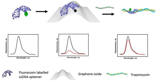 The ease of making these kinds of colloidal optical sensors comes along lower LOD values, therefore showing decreased sensitivity when compared with the electrochemical counterparts. However, like the electrochemical aptamers based on voltametric measurements, the combination of colloidal probes with more efficient nanomaterials helps improve the performance of the resulting aptasensor as reported in many cases. The first example to be recalled is described by Chinnappan et al. [] and relies on a basic improvement where GO is used as a platform for fluorescent aptamers and detection of tropomyosin, a major shrimp allergen, using fluorescence spectroscopy (Figure 14). The authors investigated the method by using several fluorescein-tagged aptamers differing for the length and provided a simple method based on GO-driven quenching to detect the analyte in solution. Namely, it is known that 2D nanomaterials interacts with both double- and single-stranded DNA sequences via non-covalent π-π stacking and hydrophobic interactions []; in this condition, when fluorescent aptamers interact with GO, the fluorophore is readily quenched so long as the nucleic acid is attached. In this example, a truncated fluorescent fluorescein–aptamer conjugate is used as a recognizing probe and its fluorescence is shown to increase linearly via the addition of an increasing concentration of tropomyosin, likely because the target molecules upon interaction with the truncated aptamer trigger the fluorescence signal by detaching from the GO surface to the solution state. Interestingly, the authors claimed that the truncated form of the fluorescent aptamer results are more sensitive than longer sequences, presumably due to (i) the elimination of non-essential nucleotides which may not be involved in capturing the target and (ii) their involvement in the formation of the aptamer-tertiary structure that reduces the chance of binding to tropomyosin. The authors showed that the aptasensor is provided with an LOD of 2 nM within a range of 0 to 1.3 μM to detect the tropomyosin allergen from shellfishes as well as chickens.