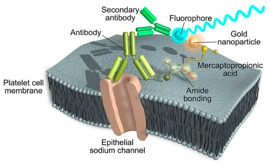 A proper example is described by García-Rubio et al. [] where AuNPs are conjugated to antibodies to detect the epithelial sodium-channel protein present on platelets through simple, visible spectroscopy (Figure 15). The immunosensor is obtained using commercial AuNPs reacted with 3-mercaptopropionic acid in water to ensure complete functionalization of the metal surface through thiol-gold bonds thus leaving many -COOH groups accessible for further functionalization. In this condition, antibodies specific for the epithelial sodium-channel protein can be covalently linked to the functionalized gold surface by taking advantage of the EDC/NHS crosslink method resulting in stable hydrophilic AuNPs–antibodies conjugates with optical absorption in the visible spectrum. Upon binding with the target analyte, i.e., the epithelial sodium channel, a secondary fluorescent antibody can be used to detect the complex formed. In these conditions, the samples containing the epithelial sodium channel treated with AuNPs-antibodies probes show a much larger intensity if compared to samples treated only with anti-epithelial sodium channel antibodies; this result is likely due to the plasmonic effect occurring on the surface of the metal NPs that affects the optical properties of the neighboring fluorophores []. To note, in this configuration the distance between the antibodies and the metal surface provided by indirect conjugation through 3-mercaptopropionic acid as a short ligand is propaedeutic for avoiding the quenching effect that is induced by the plasmonic nanostructures at very small distances from the fluorophore. The authors used their immunosensor to discriminate between hypertensive and normotensive individuals, which represents a useful diagnostic tool for arterial hypertension.