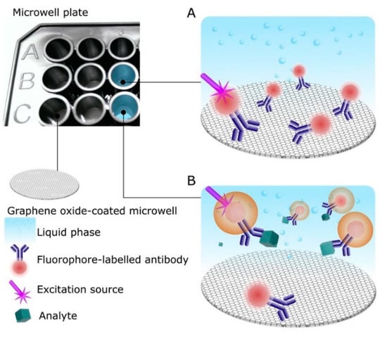 The enhancing or quenching effect of nanomaterials based on their plasmonic behavior is found to be useful, taking advantage of 2D nanostructures as reported for GO sheets. GO, similar to metal NPs, triggers significant changes on the physical properties of molecules thus becoming a suitable tool for detecting low concentrations of analytes via optical methods. In their study, Ortiz-Riaño et al. [] demonstrated the possibility of detecting the prostate-specific antigen in urine by taking advantage of GO-induced quenching of fluorescent QDs-functionalized antibodies (Figure 16). The authors used multi-well polystyrene amino-functionalized black plates as measuring platforms where each well is filled with cationic poly-lysine glass slides which act as support for the immobilization of GO. This is obtained by adding GO solutions within the wells and allowing the sheets to adsorb onto the glass surface via electrostatic interactions relying on the positively charged poly-lysine molecules and the negatively charged GO surface. As a probe, biotin-conjugated antibodies targeting the prostate-specific antigen are coupled to fluorescent streptavidin-conjugated QDs by taking advantage of the strong biotin–streptavidin interaction. The resulting QDs-antibodies complex allows the target analyte to be captured in solution without perturbing the fluorescence of the QDs. This immunosensor is realized in such a way to quench the fluorescence of the QDs-antibodies probes quickly and strongly in the absence of prostate-specific antigen molecules upon their adsorption onto the surface of the underlying GO substrate; however, when the probes capture the analytes, the resulting complex is weakly detached due to the low affinity between the GO-coated surface and the relatively long distance between the QDs and the GO, thus resulting in increased signal detection. To note, the authors used their immunosensor as a useful device for several clinically relevant analytes having an LOD value of 0.05 ng mL−1 with a working range of 0.15–10 ng mL−1, thus proving to be much more sensitive than commercially available immunoassays even without the use of fluorescence-enhancing nanomaterials.