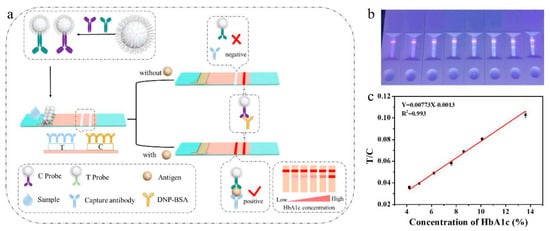 Optical immunosensor for glycosylated hemoglobin in blood samples. (a) Fluorescent BSA-wrapped CdSe-ZnSQDs conjugated to antibodies targeting the glycosylated hemoglobin are adsorbed onto a nitrocellulose membrane. (b,c) When the analyte is loaded, it binds to the fluorescent QDs that migrate towards a revelation zone where anti-human hemoglobin antibodies are present. A double fluorescent signal is detected; otherwise, in the absence of the analyte only the control fluorescent band is visible. Image adapted from [] with permission of American Chemical Society, 2022.
