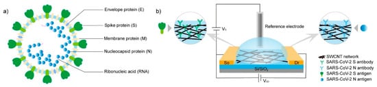 - Shao, W.; Shurin, M.R.; Wheeler, S.E.; He, X.; Star, A. Rapid Detection of SARS-CoV-2 Antigens Using High-Purity Semiconducting Single-Walled Carbon Nanotube-Based Field-Effect Transistors. ACS Appl. Mater. Interfaces 2021, 13, 10321–10327. [Google Scholar] [CrossRef]