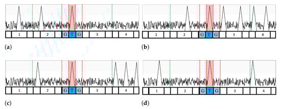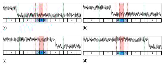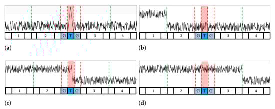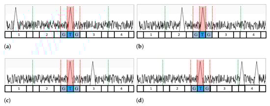 A case where two or more windows are determiend to be variable: interfering targets are in (a) windows 1 and 2; (b) windows 2–4; (c) windows 2 and 4; (d) windowd 1 and 4.