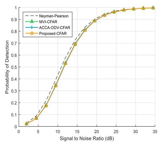 The experiments were performed with Monte Carlo simulations using the parameters listed in Table 1. The total reference window size was 36, and 1 guard cell was located next to each side of the test cell. The false alarm probability () was , and probability of false censoring () was . The carrier-to-noise ratio (CNR) was 10 dB, the noise signal had an exponential distribution, and the noise power was assumed to be 1 dB. As illustrated in Figure 6, ACCA-ODV CFAR, MVI CFAR, and the proposed CFAR algorithm showed high detection probabilities close to the optimal performance in a homogeneous environment.