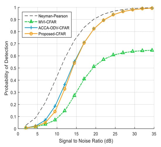 Figure 7 exhibits the detection probability when the numbers of interfering targets in the leading and lagging windows are different; there are three and four interfering targets in the leading and lagging windows, respectively. Although the performance of the MVI CFAR algorithm degrades, the ACCA-ODV CFAR and proposed CFAR algorithms maintain a high detection probability. Figure 8 shows the detection probability when the numbers of interfering targets in the reference window on both sides of the test cell are the same, and there are four interfering targets in the leading and lagging windows. The MVI-CFAR algorithm produces a lower detection probability than when the numbers of interfering targets in the leading and lagging windows differ. In contrast, the ACCA-ODV CFAR algorithm and the proposed CFAR algorithm still maintain a high detection probability.