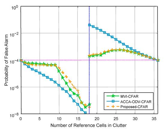 Figure 9 shows the false alarm probability in a clutter edge environment. The false alarm probability of the ACCA-ODV CFAR algorithm rapidly increases when the test cell contains a clutter edge. This is because it censors until the dataset is determined to be homogeneous [20,21]. In contrast, the MVI and proposed CFAR algorithms show similar false alarm probabilities with the desired false alarm probability compared with that of the ACCA-ODV CFAR algorithm.