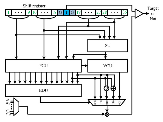 The VCU computes and compares and when the ACCA-ODV CFAR algorithm operates, as shown in Equation (21). To reduce the hardware complexity, comparative Equation (21) is modified as shown in (22) to replace the division operation of with the multiplication operation, and the structure of the VCU is shown in Figure 19.