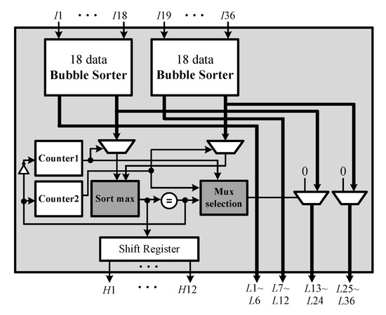 A general bubble sorter has a complex hardware architecture and a long execution time. In contrast, the ACCA-ODV CFAR algorithm does not sequentially sort all N data and only needs to sort the top N-p data. Therefore, we propose a sorter that satisfies the low-complexity and low-processing-time requirements by conducting bubble sorts with only a couple of data. The proposed sorter architecture is shown in Figure 11. After sorting 18 pieces of data, the value of the result is compared, and the top 12 pieces of data are determined, outputting them as , and , and . Because the top 12 data of each sorting result may be the top 12 data of the whole, the top 12 data are extracted by comparing each top 12 data. However, the lower six of each sorting result can never be the top 12 data, so they are output as , and . In addition, the output is 0 if the data are in the top 12 and is output as , and if not in the top 12.