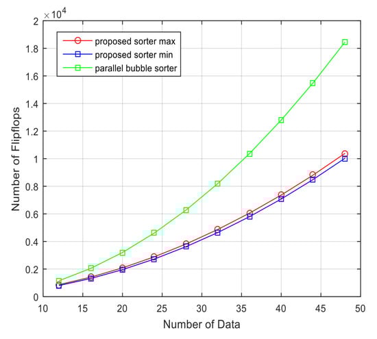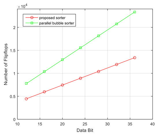 Figure 12 shows the number of register usages of the parallel bubble sorter and the proposed sorter depending on the amount of received signal data. As the amount of data to be aligned increases, the deviation between the number of register usages of the proposed sorter and that of the bubble sorter increases. Figure 13 shows a graph comparing the number of register usages according to the number of bits in the received signal. As the number of bits of the received signal increases, the number of registers used by the parallel bubble sorter and the proposed sorter increases. However, the parallel bubble sorter uses approximately two times more than the proposed sorter.