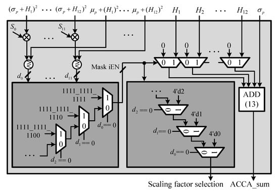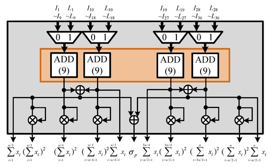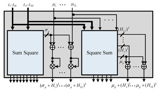 The proposed CFAR algorithm calculates the sum-square and square-sum operations when determining the received signal environment parameter. The ACCA-ODV CFAR algorithm executes the sum and square operations to determine the homogenous environment in the ordered data. The two operations are performed at different times because the environmental parameter of the received signal is generated immediately after the received signal is input. Homogeneity is determined after an alignment operation that takes a long time. Therefore, we designed an efficient hardware structure that shares the sum and square operations. The PCU is shown in Figure 14, where and are calculated to perform the ACCA-ODV CFAR algorithm. In addition, square and sum operations are performed for the environmental judgment index operations. The structure of the PCU is divided into sum-square and square-sum units, and sum and square operations are performed. The structure of a PCU is divided mainly into sum-square and square-sum units, as shown in Figure 15 and Figure 16, respectively.