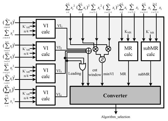 The EDU calculates the indicators for determining the environment of the received signal and the number of windows determined to be nonhomogeneous; the structure is shown in Figure 17. To this end, the and calculation units are used. The calculation unit is shown in Figure 18a, and the calculation unit is shown in Figure 18b. The division is used as in Equation (17) when performing the operation. The equation is modified to reduce the hardware complexity as in Equation (18).