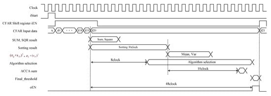 We used the proposed CFAR processor configured a MATLAB-based simulator (The MathWorks Inc., Natick, MA, USA) to conduct a performance evaluation, and thenwe designed a fixed point for hardware implementation. Subsequently, it was designed at the register transfer level (RTL) using Verilog hardware description language (HDL). It was also implemented based on an Altera Stratix II EP2S60ES FPGA device and verified with test vectors from the MATLAB-based simulator for clutter edge and multitarget environments. Table 3 shows the synthesis results when the number of reference cells of the proposed CFAR processor was 16, and 8260 LUTs and 3823 registers were used. A timing diagram for the proposed processor is shown in Figure 20. It was confirmed that the maximum clock speed was 118.39 MHz and the processing time was 0.6 s.
