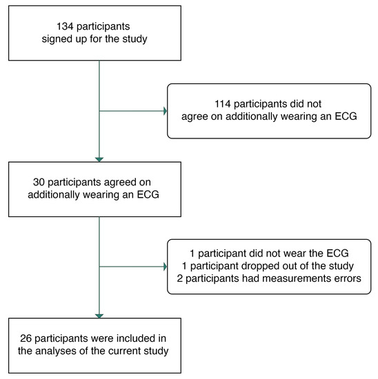 As part of the larger study, 30 participants agreed to additionally wear an ECG device for one week during data collection. Four participants were not included in the present sample. One participant did not wear the ECG device and another one dropped out before data collection started. Two participants were excluded because of measurement errors, showing zero variation in ECG measures across the week. The inclusion and exclusion of participants are depicted in Figure 1. The final sample consisted of 26 generally healthy participants (23 females) with a mean age of 23.8 years (SD = 3.0 years; range: 19–29 years). The mean body mass index (BMI) was 22.3 kg/m2 (SD = 4.0 kg/m2; range: 18–34 kg/m2).