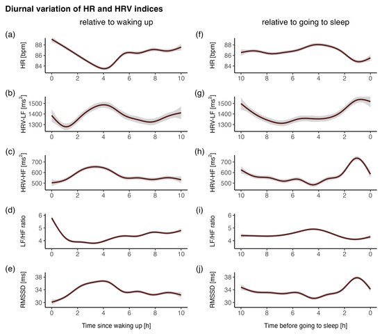 Diurnal variations in the HR and HRV indices (a–e) relative to waking up (start of wear time) and (f–j) relative to going to sleep (end of wear time). (a,f) HR, heart rate; (b,g) HRV-LF, low-frequency power; (c,h) HRV-HF, high-frequency power; (d,i) LF/HF ratio, ratio of low- to high-frequency power; (e,j) RMSSD, root-mean-square of successive differences. The indices were averaged across all individuals and days.
