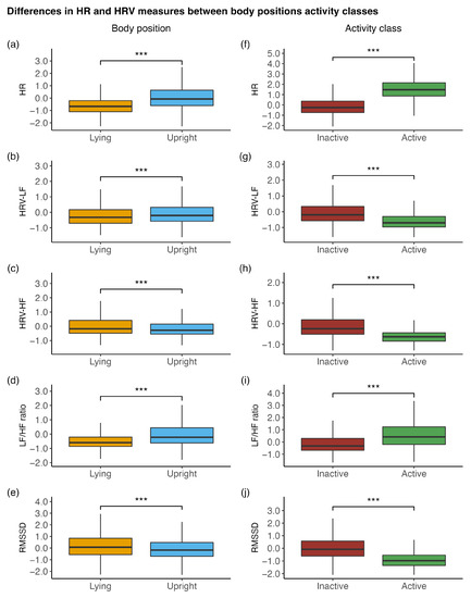 Differences in the HR and HRV measures between (a–e) body positions (lying vs. upright) and (f–j) activity classes (inactive vs. active). HR, heart rate; HRV-LF, low-frequency power; HRV-HF, high-frequency power; LF/HF ratio, ratio of low- to high-frequency power; RMSSD, root-mean-square of successive differences. All depicted HR and HRV measures were within-individual standardised. *** p < 0.001.