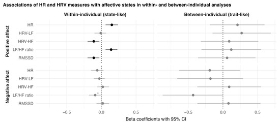 The linear regressions revealed no significant between-individual associations of the HR and HRV measures with positive or negative affect. All associations are displayed in Table 7. The results of the within- and between-individual analyses are presented in Figure 4.